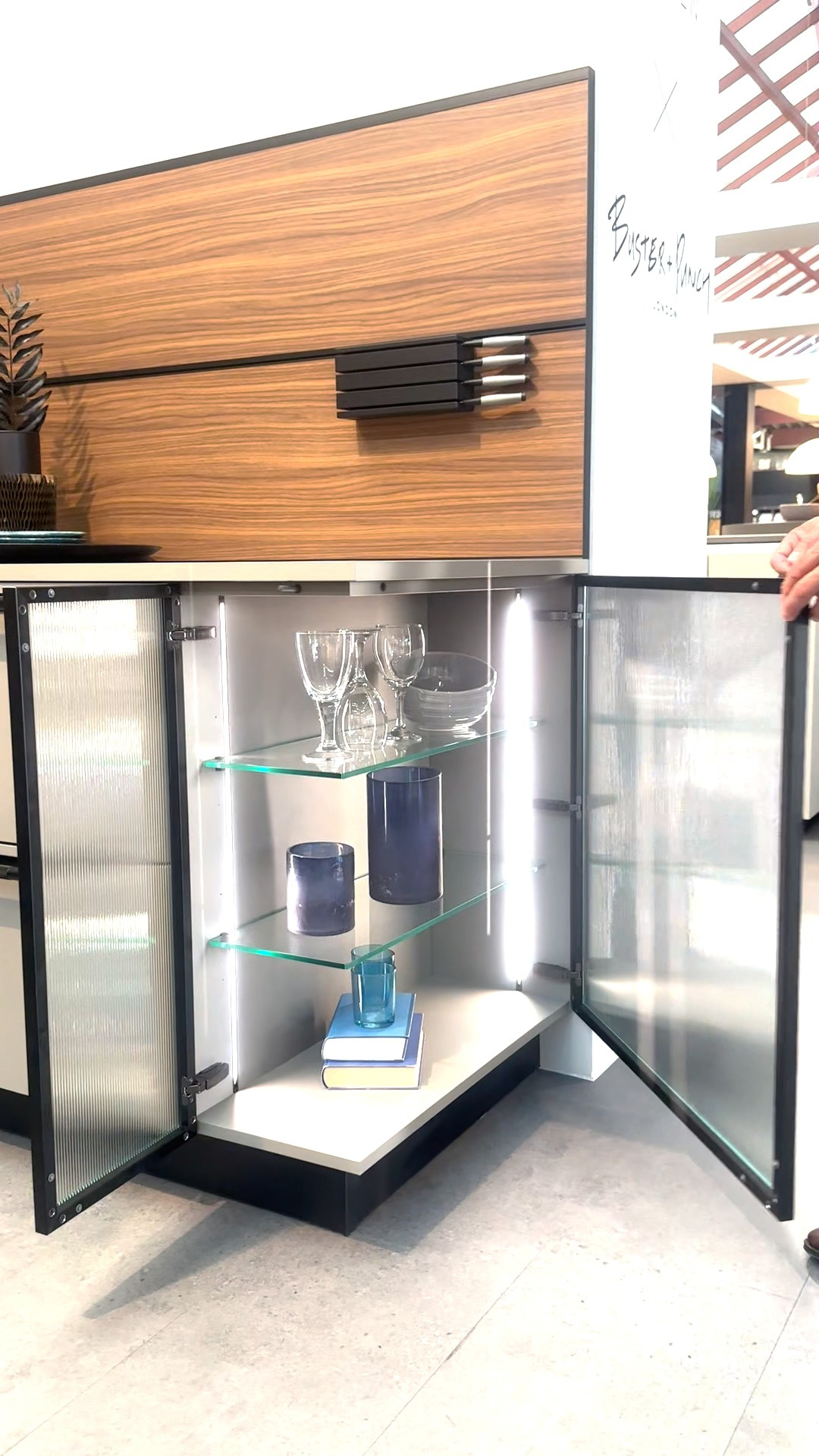 Gør hjørnet på dine skabe elegante med dette vitrineskab, der har flotte glashylder og lys i siderne. Skabet åbnes både foran og sidelæns